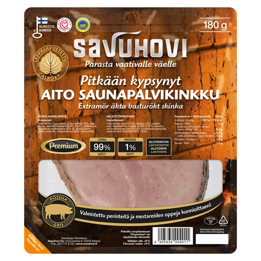 Sian kinkku (kasvatettu ja teurastettu: EU), vesi, suola, stabilointiaineet (E450, E451), dekstroosi, hapettumisenestoaine (E316), säilöntäaine natriumnitriitti. Lihapitoisuus 99%. Savustettu.