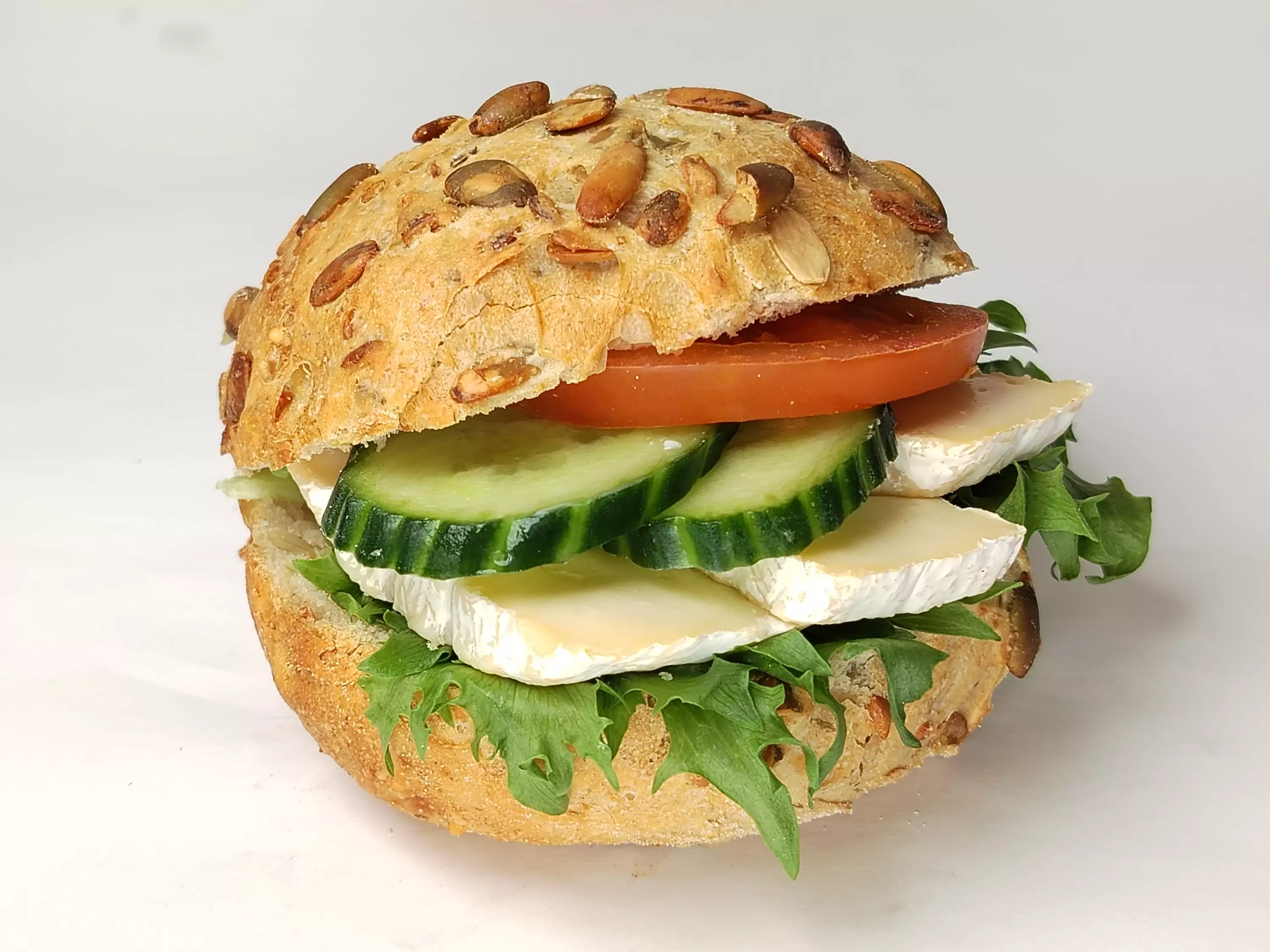 Täytteet: Brie-juusto (pastoröitu lehmänMAITO, suola, maitohappoviljelmä, valkohomeviljelmä), tomaatti, kurkku, Oivariini (VOI, rypsiöljy, vesi, suola, D-vitamiini), salaatti