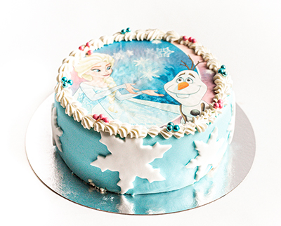 Päällä: Vaaleansininen ja valkoinen sokerimassa (sokeri, tärkkelyssiirappi, vesi, osittain kovetettu kasvirasva (palmu, rypsi, soija, shea),