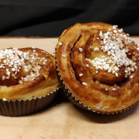 Ainesosat: Riisijauho, perunajauho, tapiokatärkkelys, täysjyvä durrajauho, perunahiutale, vesi, sokeri, KANANMUNA, rapsiöljy, margariini (palmuöljy, rapsiöljy, kookosrasva, vesi, suola, väri (E160a)), hiiva, psyllium, merisuola, kardemumma, kaneli, ksantaani, entsyymit.