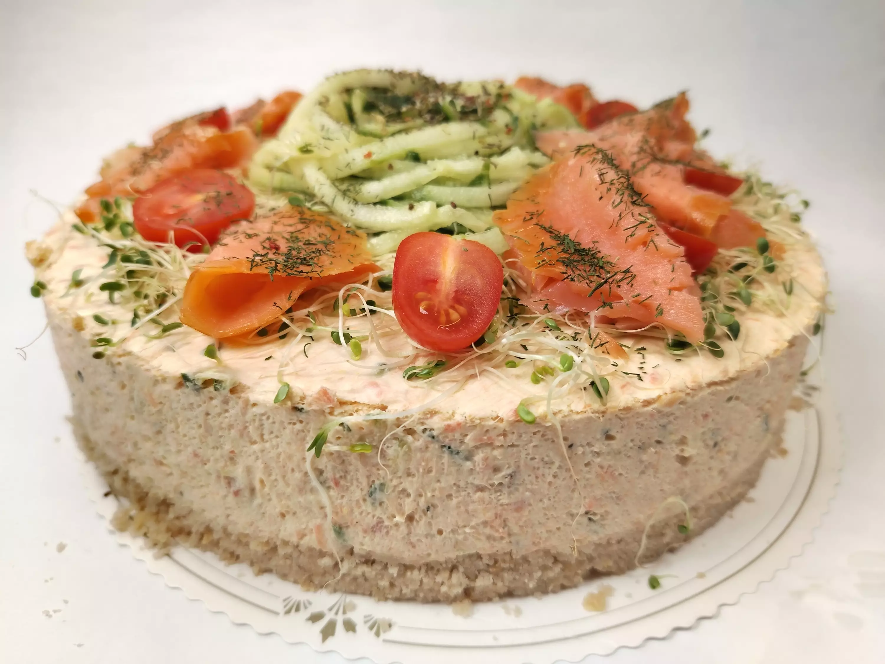 Ainesosat: Koristelu: Savulohi, kurkku, porkkana, tomaatti, kylmäsavulohi, auringonkukan verso