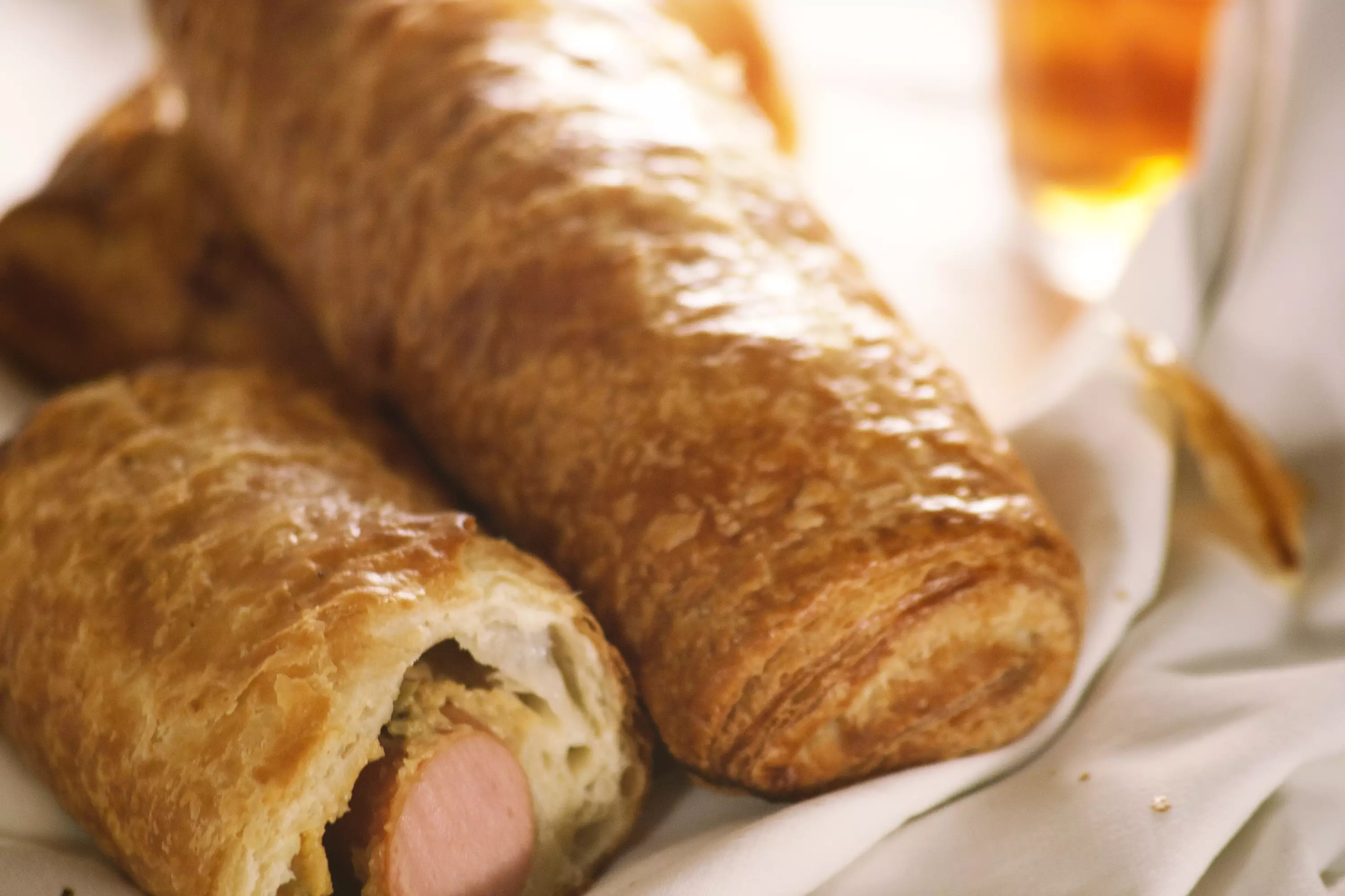 Croissant-tyyppisestä taikinasta tehty piirakka nakilla ja sinappi-kurkkusalaattitäytteellä.