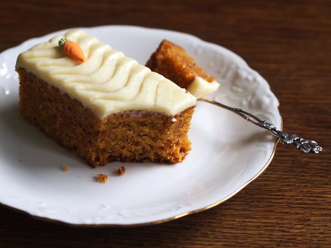 Cocktailkokoinen porkkanaleivos, hyvin säilyvä. Puolikas kuvan leivoksesta.