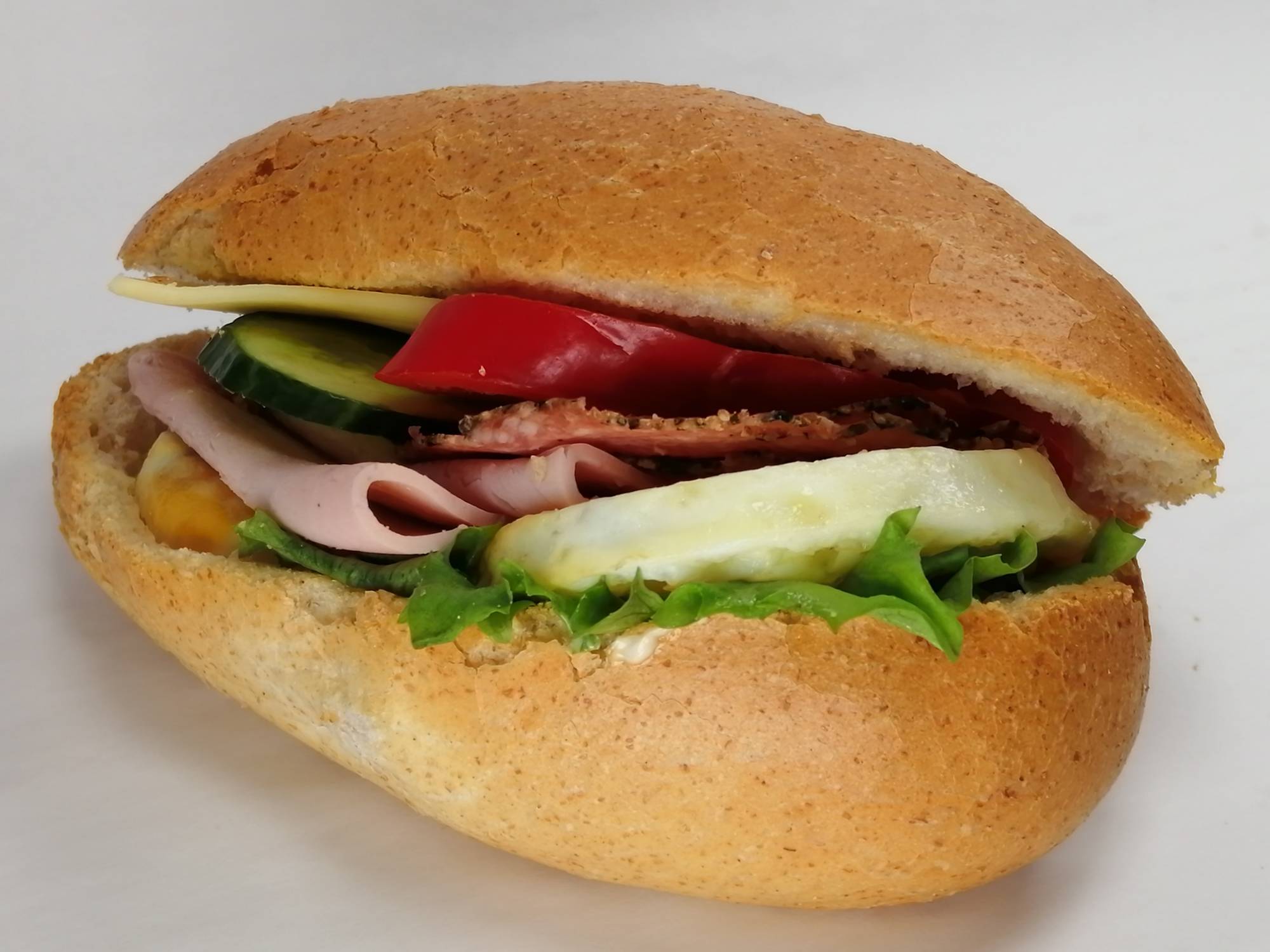 Täyte: Savuhovin kinkku ja meetvursti, JUUSTO, paistettu KANANMUNA, salaatti, tomaatti, kurkku, laktoositon Oivariini (VOI, rypsiöljy, vesi, suola, D-vitamiini). Kasvikset voivat vaihdella kauden/sesongin mukaan.